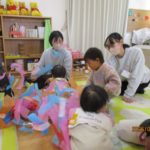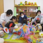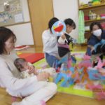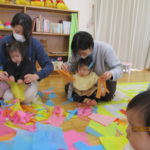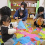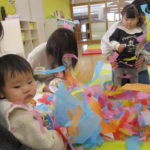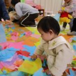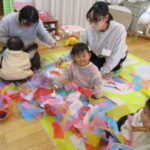 和やかな雰囲気の中お片付けをして、みんなでアンパンマンの「サンサン体操」をしました😄音楽が流れると自然と体を揺らす姿がなんとも可愛い~😍おうちの人と一緒にみんなとっても楽しそうでした‼️「フラワー紙で遊ぼう」ではカラフルな色のフラワー紙に心もウキウキ💖初めての感触に不思議そうな顔をしながらも手を伸ばして触ってみたり、指先を使ってビリビリ破いたりする子もいました。たくさん破いた後はうちわで飛ばして楽しみました。集めて集めてそれ~の掛け声でフラワー紙を飛ばすと「わ~!」と歓声が・・・👏子どもより大人が楽しんじゃいましたぁ😁