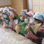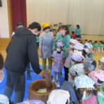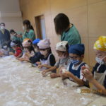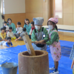 ホールに入ると蒸したお米の、とってもいい匂い。いよいよ杵でつきはじめると、ごはん(もち米の)が杵でつぶされ、だんだんお餅に近づいてきて、子どもたちも「わー」と歓声を上げ大喜び。とっても良く見ていました。青組さんは、お餅を自分で丸める時「やわらか~い」とお餅の感触を楽しんでいました。つきたてをお部屋おいしくいただきました 🙂