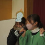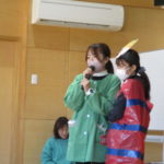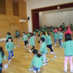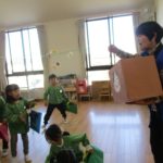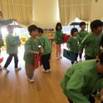 今日は、節分。ホールで節分集会を行いました。節分について、クイズをやったり、歌を歌ったりしていると・・・・・。泣き虫鬼、甘えんぼ鬼、寒がり鬼、おこりんぼ鬼が園に登場しみんなで退治しましたね。